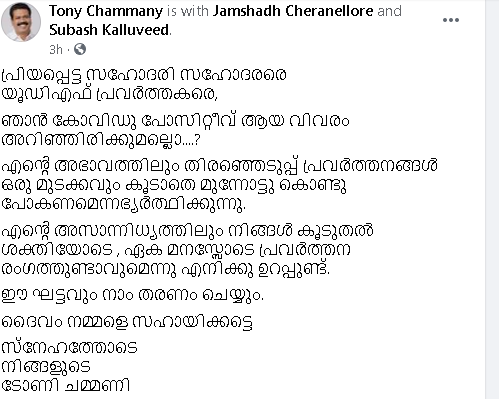 തന്റെ അഭാവത്തില് തിരഞ്ഞെടുപ്പ് പ്രചാരണവുമായി തുടരണമെന്നും ഇക്കാര്യത്തില് ഒറ്റക്കെട്ടായി ഒരേമനസ്സോടെ എ്രവര്ത്തിക്കണമെന്നും ടോണി ആവശ്യപ്പെട്ടു. ഈ അവസ്ഥയില് നിന്ന് നാം വേഗം തിരിച്ചുകയറുമെന്നും അദ്ദേഹം പറഞ്ഞു. തൊടുപുഴയില് എല്.ഡി.എഫ് സ്ഥാര്ത്ഥി കെ.ഐ ആന്റണിയും കോവിഡിന്റെ പിടിയിലാണ്. യു.ഡി.എഫ് സ്്ഥാനാര്ത്ഥി പി.ജെ ജോസഫ് കോവിഡ് മുക്തനായി അടുത്തകാലത്താണ് പ്രചാരണത്തില് സജീവമായത്.