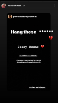 തിരുവനന്തപുരത്തെ അടിമലത്തുറയിൽ ലാബ്രഡോര് ഇനത്തില്പ്പെട്ട ബ്രൂണോ എന്ന നായയെ മൂന്ന് പേർ ചേർന്ന് തല്ലി കൊന്ന സംഭവത്തിൽ പ്രതികരിച്ച് നടി നസ്രിയയും പൂർണിമ ഇന്ദ്രജിത്തും. കഴുവിലേറ്റൂ.. സോറി ബ്രൂണോ എന്നായിരുന്നു ജസ്റ്റീസ് ഫോർ ബ്രൂണോ എന്ന ഹാഷ്ടാഗിൽ ഇൻസ്റ്റാഗ്രാം സ്റ്റോറിലൂടെ പൂർണിമ പ്രതികരിച്ചത്. എന്തുക്കൊണ്ട് മനുഷ്യർ ഇങ്ങനെചെയ്യുന്നുവെന്നായിരുന്നു ലാബ്രഡോര് ഇനത്തില്പ്പെട്ട ഒരു നായയുടെ ചിത്രം പങ്കുവെച്ചുകൊണ്ട് നസ്രിയയുടെ പ്രതികരണം. ബ്രൂണോയ്ക്ക് നീതിവേണമെന്ന് ആവശ്യപ്പെട്ടുകൊണ്ടുള്ള പൂർണിമയുടെ ഇൻസ്റ്റാഗ്രാം സ്റ്റോറിയും നസ്രിയ ഷെയർ ചെയ്തിട്ടുണ്ട്.