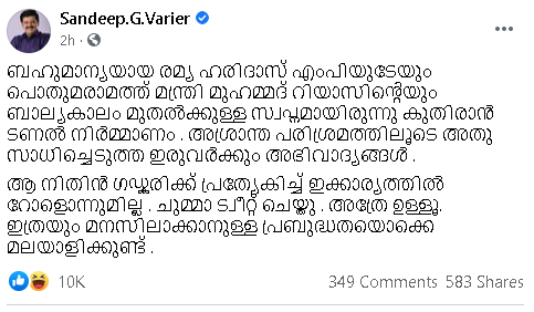 രമ്യ ഹരിദാസിന്റെയും, മുഹമ്മദ് റിയാസിന്റെയും കുട്ടിക്കാലം മുതൽക്കുള്ള സ്വപ്നമായിരുന്നു കുതിരാൻ ടണൽ നിർമ്മാണമെന്നും, അശ്രാന്ത പരിശ്രമത്തിലൂടെ അതു സാധിച്ചെടുത്ത ഇരുവർക്കും അഭിവാദ്യങ്ങളെന്നുമാണ് സന്ദീപ് വാര്യർ പരിഹസിച്ചിരിക്കുന്നത്.