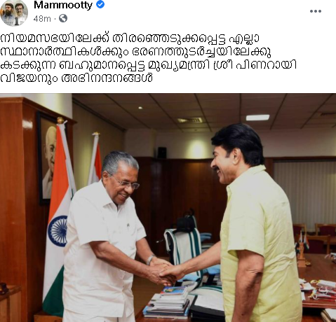 നിയമസഭയിലേക്ക് തിരഞ്ഞെടുക്കപ്പെട്ട എല്ലാ സ്ഥാനാര്ത്ഥികള്ക്കും ഭരണത്തുടര്ച്ചയിലേക്കു കടക്കുന്ന ബഹുമാനപ്പെട്ട മുഖ്യമന്ത്രി ശ്രീ പിണറായി വിജയനും അഭിനന്ദനങ്ങള് എന്നാണ് മമ്മൂട്ടി എഴുതിയത്..