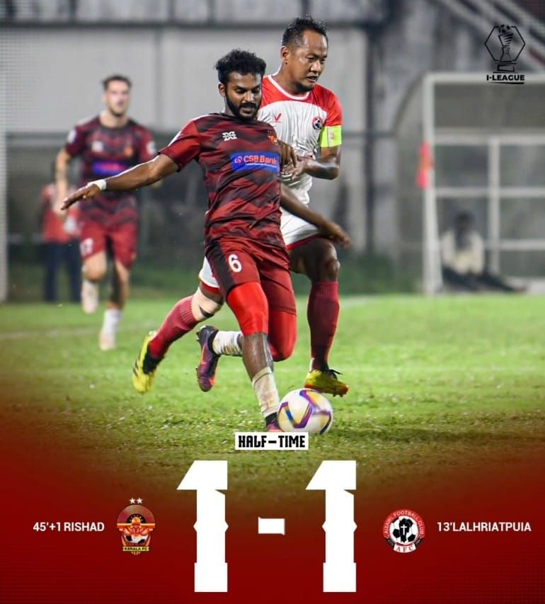 ഐ ലീഗ് ഫുട്ബോളിൽ ഗോകുലം കേരള എഫ് സി ഐസ്വാൾ എഫ് സി മത്സരം സമനിലയിൽ പിരിഞ്ഞു. രണ്ടു ഗോളുകളും പിറന്നത് ആദ്യ പകുതിയിൽ ആയിരുന്നു. ആദ്യം മുതൽ അറ്റാക്ക് ചെയ്തു കളിച്ച ഗോകുലം കേരളയെ തടയിടാൻ ഐസ്വാൾ ഡിഫെൻഡേസിനായി, മറുവശത്ത് വീണുകിട്ടിയ അവസരം 13 ആം മിനിറ്റിൽ ഗോൾ ആക്കുന്നതിൽ ഐസ്വാൾ വിജയിച്ചു. മറുപടി ഗോളിനായി നന്നായി പണിപ്പെട്ട ഗോകുലത്തിന് ആദ്യ പകുതിയുടെ എക്സ്ട്രാ ടൈമിലാണ് ക്യാപ്റ്റൻ സസെർജിയോ നൽകിയ പാസ്സിലൂടെ മലയാളി താരം റിഷാദ് ഗോൾ നേടുന്നത്. ഐസ്വാൾ കീപ്പർക്ക് സേവ് ചെയ്യാൻ അവസരം നൽകാതെ ഷോട്ട് ലക്ഷ്യം കണ്ടപ്പോൾ സ്കോർ ആദ്യ പകുതിയിൽ 1 -1.
