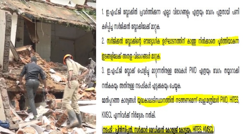 ഇ.എഫ്.ജി ബ്ലോക്കില്‍ പ്രവര്‍ത്തിക്കുന്ന എല്ലാ വിഭാഗങ്ങളും എത്രയും വേഗം പുതുതായി പണി കഴിപ്പിച്ച സര്‍ജിക്കല്‍ ബ്ലോക്കിലേക്ക് മാറ്റുക, സര്‍ജിക്കല്‍ ബ്ലോക്കിന്റെ ഔദ്യോഗിക ഉദ്ഘാടനത്തിന് കാത്തു നില്‍ക്കാതെ പൂര്‍ത്തിയാകുന്ന ഇടങ്ങളിലേക്ക് അതതു വിഭാഗങ്ങള്‍ മാറ്റുക, ഇ.എഫ്.ജി ബ്ലോക്ക് പൊളിച്ചു മാറ്റുന്നതിനുള്ള രേഖകള്‍ PWD എത്രയും വേഗം തയ്യാറാക്കി നല്‍കുകയും അതിനുള്ള നടപടികള്‍ എടുക്കുകയും ചെയ്യുക എന്നിങ്ങനെയായിരുന്നു യോഗത്തിലെ നിര്‍ദേശങ്ങള്‍. ഇക്കാര്യങ്ങള്‍ യുദ്ധകാലാടിസ്ഥാനത്തില്‍ നടത്തണമെന്ന് മന്ത്രിമാര്‍ PWD, HITES, KMSCL എന്നിവര്‍ക്ക് മന്ത്രിമാര്‍ നിര്‍ദ്ദേശം നല്‍കിയതായും മിനുട്‌സില്‍ വ്യക്തമാക്കുന്നുണ്ട്.