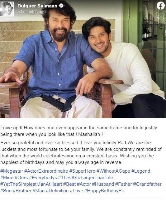 ‘ഞാന്‍ നിര്‍ത്തി. എങ്ങിനെയാണ് വാപ്പച്ചി നിങ്ങള്‍ ഇങ്ങനെ ഇരിക്കുമ്പോള്‍ മറ്റൊരാള്‍ക്ക് ഈ ഫ്രെയിമില്‍ നില്‍ക്കാന്‍ പോലും കഴിയുക. മാഷാള്ള. ഞാന്‍ വാപ്പച്ചിയെ അനന്തമായി സ്‌നേഹിക്കുന്നു. വാപ്പച്ചിയുടെ കുടുംബമാവാന്‍ സാധിച്ചതില്‍ ഭാഗ്യം ചെയ്തവരാണ് ഞങ്ങള്‍. അങ്ങയെ ലോകം ആഘോഷിക്കുമ്പോള്‍ അത് ഞങ്ങള്‍ ഓര്‍ക്കും. പിറന്നാള്‍ ആശംസകള്‍ നേരുന്നു. പിന്നെ വാപ്പച്ചിക്ക് വയസ് പിന്നോട്ടാവട്ടെ എന്നും ആശംസിക്കുന്നു.’- ദുല്‍ഖര്‍ സല്‍മാന്‍