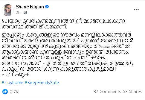 പ്രിയപ്പെട്ടവര് കണ്മുന്നില് നിന്ന് മാഞ്ഞുപോകുന്ന അവസ്ഥ അതിഭീകരമാണ്. ഇപ്പോഴും കാര്യങ്ങളുടെ ഗൗരവം മനസ്സിലാക്കാത്തവര് നിരവധിയാണ്, അനാവശ്യമായി പുറത്ത് ഇറങ്ങുന്നവര് അവരുടെ മുഴുവന് കുടുംബത്തെയും അപകടത്തില് ആക്കുകയാണ് എന്നുള്ള ബോധ്യം ഉണ്ടായിരിക്കണം. ആയതിനാല് സ്വയം ശുചിത്വം പാലിക്കുക, അനാവശ്യമായി പുറത്ത് ഇറങ്ങാതിരിക്കുക, ആരോഗ്യ വകുപ്പ് നിര്ദേശിക്കുന്ന കാര്യങ്ങള് കൃത്യമായി പാലിക്കുക.’