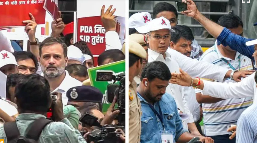 പ്രതിപക്ഷ നേതാവ് രാഹുൽ ഗാന്ധിയുടെ നേതൃത്വത്തിൽ ഇന്ത്യ സഖ്യത്തിലെ കക്ഷികളുടെ എംപിമാരെല്ലാം മാർച്ചിൽ പങ്കെടുത്തു. ട്രാന്സ്പോര്ട്ട് ഭവന് മുന്നിൽ ബാരിക്കേഡ് ഉപയോഗിച്ച് പ്രതിഷേധക്കാരെ പോലീസ് തടഞ്ഞു. പ്രാദേശിക ഭാഷകളിലടക്കമുള്ള പ്ലക്കാര്ഡുകളുമായാണ് പ്രതിഷേധപ്രകടനം നടത്തിയത്.