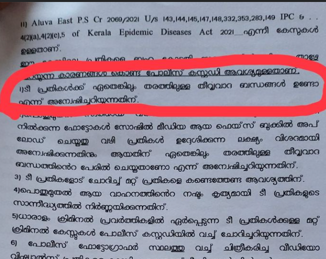 ആലുവയിലെ നിയമവിദ്യാർഥിനി മൊഫിയ പര്വീന്റെ ആത്മഹത്യാക്കേസില് പൊലീസ് സ്റ്റേഷനില് സമരം ചെയ്ത പ്രാദേശിക കോൺഗ്രസ് നേതാക്കള്ക്ക് തീവ്രവാദ ബന്ധം സംശയിക്കുന്നുവെന്ന് പൊലീസ്.അറസ്റ്റിലായവരുടെ റിമാന്റ് റിപ്പോര്ട്ടിലാണ് പരാമർശം.സമരവുമായി ബന്ധപ്പെട്ട് പൊതുമുതല് നശിപ്പിച്ച കുറ്റത്തിന് അറസ്റ്റ് ചെയ്ത അൽ അമീൻ, അഷ്റഫ്, നെജീബ് എന്നിവരെ കസ്റ്റഡിയില് ആവശ്യപ്പെട്ട് കോടതിക്ക് നല്കിയ റിപ്പോര്ട്ടിലാണ് പ്രതികള്ക്ക് ഏതെങ്കിലും തരത്തിലുള്ള തീവ്രവാദ ബന്ധങ്ങള് ഉണ്ടോയെന്ന് അന്വേഷിക്കും എന്ന പരാമര്ശം വിവാദമായത്.