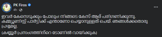 വഖഫ് സംരക്ഷണ റാലിയിൽ പങ്കെടുത്തവർക്കെതിരെ കേസെടുത്ത സംസ്ഥാന സർക്കാർ തീരുമാനത്തിനെതിെര രൂക്ഷ വിമർശനവുമായി യൂത്ത് ലീഗ് സംസ്ഥാന ജനറൽ സെക്രട്ടറി പി കെ. ഫിറോസ്.ഇവർ കേസെടുക്കും പോലും! നിങ്ങടെ കേസ് ആര് പരിഗണിക്കുന്നു. കമ്മ്യൂണിസ്റ്റ് പാർട്ടിക്ക് എന്താണോ ചെയ്യാനുള്ളത് ചെയ്. ഞങ്ങൾക്കതൊരു പ്രശ്നമല്ല‘- ഫിറോസ് ഫെയ്സ്ബുക്കിൽ കുറിച്ചു.