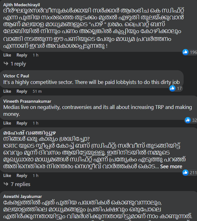 ‘ദീര്‍ഘദൂര സര്‍വീസുകള്‍ക്കായി സര്‍ക്കാര്‍ ആരംഭിച്ച കെ. സ്വിഫ്റ്റ് എന്ന പുതിയ സംരഭത്തെ തുടക്കം മുതല്‍ എഴുതി തുലയ്ക്കുവാനാണ് മലയാള മാധ്യമങ്ങളുടെ ‘പാഴ് ‘ ശ്രമം. പ്രൈവറ്റ് ബസ് ലോബിയില്‍ നിന്നും പണം, അല്ലെങ്കില്‍ കുപ്പിയും കോഴിക്കാലും വാങ്ങി നടത്തുന്ന ഈ പണിയുടെ പേരും മാധ്യമപ്രവര്‍ത്തനം എന്നാണ് ഇവര്‍ അവകാശപ്പെടുന്നത്,