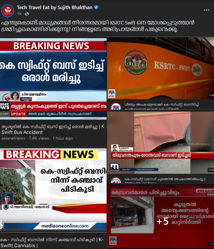 കെ.എസ്.ആര്‍.ടി.സി സ്വിഫ്റ്റ് ബസിനെ കുറിച്ച് മാധ്യമങ്ങളിൽ വരുന്ന അപകീര്‍ത്തികരമായ വാര്‍ത്തകള്‍ക്കെതിരെ വിമർശനം.എന്തുകൊണ്ട് മാധ്യമങ്ങള്‍ നിരന്തരമായി കെ.എസ്.ആര്‍.ടി.സി സ്വിഫ്റ്റിനെ മോശപ്പെടുത്താന്‍ ശ്രമിച്ചുകൊണ്ടിരിക്കുന്നതെന്ന് യൂട്യൂബര്‍ സുജിത്ത് ഭക്തന്‍(ടെക് ട്രാവലര്‍) ചോദിച്ചു.