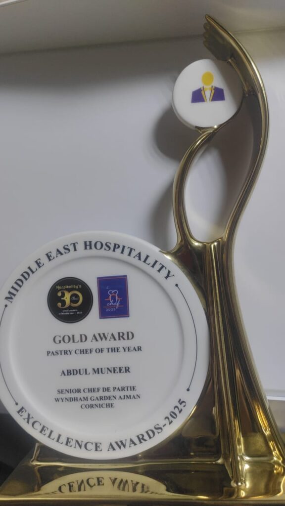 പാചക മേഖലയിൽ നൈപുണ്യം പുറത്തെടുക്കാനും മികച്ച പാചകക്കാരനെ കണ്ടെത്തുന്നതിനും വേണ്ടി നടത്തിയ ഹോസ്പിറ്റാലിറ്റി ഗ്രൂപ്പ് 8-ാമത് മിഡിൽ ഈസ്റ്റ് ഷെഫ് എക്സലൻസ് അവാർഡുകൾ ഡൗണ്ടൗൺ ദുബായിലെ അതിശയകരമായ അഡ്രസ് സ്കൈവ്യൂ ഹോട്ടലിൽ പ്രഖ്യാപിച്ചു.കോഴിക്കോട് പെരിങ്ങളം സ്വദേശി പുതിയോട്ടിൽ അബ്ദുൽ മുനീർ ഗോൾഡ് മെഡൽ സ്വന്തമാക്കി.