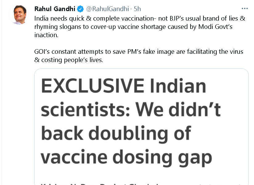 കോവിഷീല്ഡ് വാക്സിന് ഡോസുകള് തമ്മിലുള്ള ഇടവേള ഇരട്ടിയാക്കി കൊണ്ടുള്ള കേന്ദ്രസര്ക്കാര് തീരുമാനം, ശാസ്ത്രസംഘത്തിന്റെ യോജിപ്പോടെയുള്ളതല്ലെന്ന വാര്ത്തയുടെ സ്ക്രീന്ഷോട്ടും രാഹുല് ട്വീറ്റിനൊപ്പം പങ്കുവെച്ചിട്ടുണ്ട്.