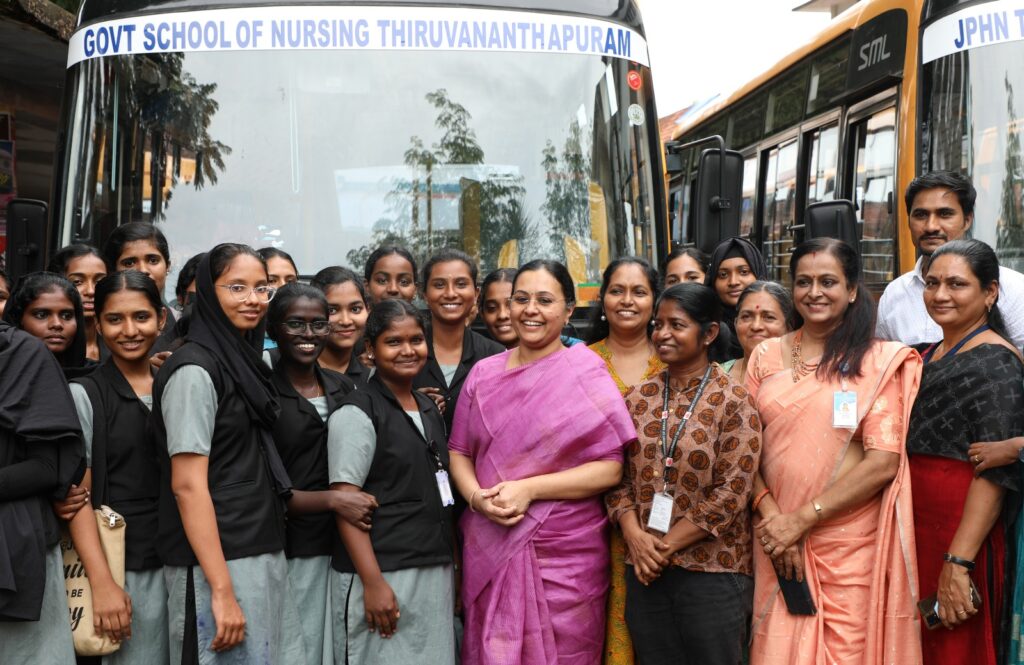 സംസ്ഥാനത്തെ 5 നഴ്സിംഗ് സ്കൂളുകള്ക്കും 3 ജെപിഎച്ച്എന് ട്രെയിനിംഗ് സെന്ററുകള്ക്കും അനുവദിച്ച ബസുകളുടെ ഫ്ളാഗ് ഓഫ് ആരോഗ്യ വകുപ്പ് മന്ത്രി വീണാ ജോര്ജ് നിര്വഹിച്ചു. കേരള നഴ്സിംഗ് ആന്റ് മിഡ് വൈവ്സ് കൗണ്സില് ആരോഗ്യ വകുപ്പിന് കൈമാറിയ 1.83 കോടി രൂപ വിനിയോഗിച്ചാണ് ബസുകള് വാങ്ങിയത്. തിരുവനന്തപുരം, കോട്ടയം, തൃശൂര്, ഇടുക്കി മുട്ടം, പത്തനംതിട്ട ഇലന്തൂര് എന്നീ നഴ്സിംഗ് സ്കൂളുകള്ക്കും തൈക്കാട് എസ്.സി./എസ്.ടി. ജെപിഎച്ച്എന് ട്രെയിനിംഗ് സെന്റര്, പാലക്കാട് പെരിങ്ങോട്ടുകുറിശ്ശി ജെപിഎച്ച്എന് ട്രെയിനിംഗ് സെന്റര്, കാസര്ഗോഡ് ജെപിഎച്ച്എന് ട്രെയിനിംഗ് സെന്റര് എന്നിവയ്ക്കാണ് ബസ് അനുവദിച്ചത്.