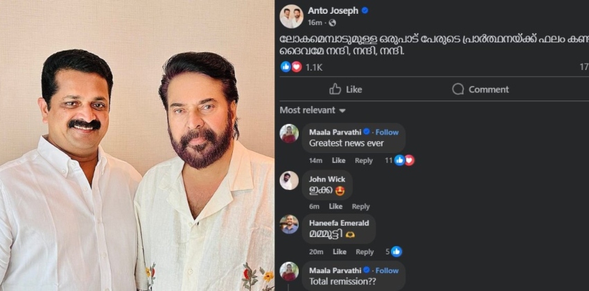 ലോകമെമ്പാടുമുള്ള ഒരുപാട് പേരുടെ പ്രാർത്ഥനയ്ക്ക് ഫലം കണ്ടെന്ന് നിർമാതാവ് ആന്റോ ജോസഫ്. ഫേസ്ബുക്കിൽ ഒരു ചെറിയ കുറിപ്പിലൂടെയാണ് ആന്റോ ജോസഫ് ഇക്കാര്യം പറഞ്ഞത്. എന്താണ് ആന്റോ ഉദ്ദേശിച്ചതെന്ന് ചിലർക്ക് മനസിലായില്ലെങ്കിലും പോസ്റ്റിന് താഴെ വരുന്ന കമന്റുകളിൽ മുഴുവൻ മമ്മൂട്ടിയാണ്. ദൈവമേ നന്ദിയെന്നും ആന്റോ പോസ്റ്റിൽ കൂട്ടിച്ചേർത്തു.