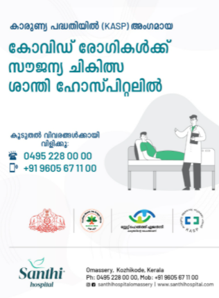 കാരുണ്യ പദ്ധതിയിൽ (KASP) അംഗമായവർക്കും, അവരുടെ കുടുംബാംഗങ്ങൾക്കും, സർക്കാർ ആശുപത്രിയിൽ നിന്ന് റഫർ ചെയ്ത കാരുണ്യ പദ്ധതിയിൽ അംഗങ്ങളായ കോവിഡ് രോഗികൾക്കും കോവിഡ് പാക്കേജ് പ്രകാരമുള്ള ചികിത്സ തികച്ചും സൗജന്യമായി ശാന്തി ഹോസ്പിറ്റലിൽ ലഭ്യമാകും.നിലവിൽ 8 ഐസിയു ബെഡ് ഉൾപ്പെടെ 60 ഓളം കിടക്കകൾ ആണ് കോവിഡ് ചികിത്സയ്ക്കായി ശാന്തി ഹോസ്പിറ്റൽ ക്രമീകരിച്ചിരിക്കുന്നത്.കൂടാതെ KASP മായി ബന്ധപ്പെട്ട സംശയ നിവാരണത്തിനും മറ്റെല്ലാ സഹായത്തിനായി 24 മണിക്കൂറും പ്രവർത്തിക്കുന്ന ഹെൽപ്പ് ഡെസ്കും ശാന്തി ഹോസ്പിറ്റലിൽ പ്രവർത്തനമാരംഭിച്ചിട്ടുണ്ട്.