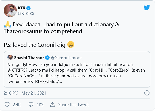 കൊവിഡ് മരുന്നുകളുടെ പേരില് ട്വിറ്ററില് ശശി തരൂരിനെ ട്രോളി തെലങ്കാന മന്ത്രി കെ.ടി രാമറാവു കടിച്ചാല് പൊട്ടാത്ത കൊവിഡ് മരുന്നുകളുടെ പേരുകള് പങ്കുവെച്ചുകൊണ്ടായിരുന്നു അദ്ദേഹത്തിന്റെ ട്വീറ്റ്.മരുന്നുകളുടെ പേരിടുന്നതില് ശശി തരൂര് ജീക്ക് പങ്കുണ്ടെന്നാണ് ഞാന് സംശയിക്കുന്നത് എന്നാണ് അദ്ദേഹം പറഞ്ഞത്.