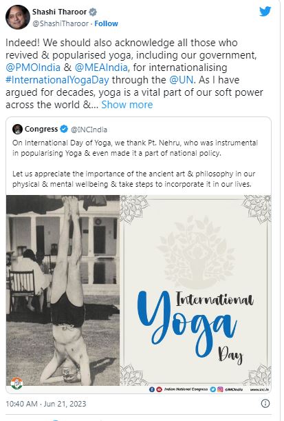 ‘‘യോഗയെ ജനകീയവും ദേശീയ നയത്തിന്റെ ഭാഗവുമാക്കുന്നതിൽ നിർണായക പങ്കുവഹിച്ച പണ്ഡിറ്റ് നെഹ്റുവിന് ഈ രാജ്യാന്തര യോഗാ ദിനത്തിൽ ഞങ്ങളുടെ നന്ദി. നമ്മുടെ ശാരീരികവും മാനസികവുമായ പുരോഗതിയിൽ ഈ പുരാതന കലയുടെയും തത്ത്വചിന്തയുടെയും പ്രാധാന്യം സ്മരിക്കാം. അത് നമ്മുടെ ജീവിതത്തിന്റെ ഭാഗമാക്കുകയും ചെയ്യാം’ – ഇതായിരുന്നു കോൺഗ്രസിന്റെ ട്വീറ്റ്.