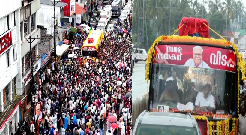 അവസാനമായി ജന്മനാട്ടിലേക്ക് നിശ്ചലനായി കേരളത്തിന്റെ സമരനായകൻ. വി എസ് അച്യുതാനന്ദന്റെ വിലാപയാത്ര കായംകുളം കഴിഞ്ഞു. ഇന്നലെ ഉച്ചയ്ക്ക് കൃത്യം രണ്ട് മണിക്ക് തലസ്ഥാനത്തുനിന്ന് ആരംഭിച്ച വിലാപയാത്ര പുലർച്ചെ 1 മണിക്ക് ആലപ്പുഴയിൽ എത്താനാണ് നിശ്ചയിച്ചിരുന്നത്. എന്നാൽ, വഴിയിലുടനീളം കാത്തുനിന്ന ജനങ്ങളുടെ വികാരാവേശത്തിൽ വിഎസിന്റെ അന്ത്യയാത്ര മണിക്കൂറുകൾ വൈകി. വിഎസിന്റെ മൃതദേഹവും വഹിച്ചുള്ള കെഎസ്ആർടിസിയുടെ പുഷ്പാലംകൃത ബസ് 16 മണിക്കൂർ പിന്നിടുമ്പോൾ കൊല്ലം ജില്ലയിലെ കരുനാഗപ്പള്ളിയിലാണ് എത്തിയത്. നിശ്ചയിച്ച സമയത്തെ മാറ്റി മാറിച്ച് ജനമനസിന്റെ സ്നേഹം താണ്ടിയാണ് വിഎസിന്റെ വിലാപയാത്ര കടന്ന് പോകുന്നത്. കോരി ചൊരിയുന്ന മഴ, ഇരുട്ടുമുറ്റി നിന്ന രാത്രി. എന്നിട്ടും പിന്തിരിഞ്ഞുപോകാതെ ജനക്കൂട്ടം പ്രിയ നേതാവിനെ അവസാനമായി കാണാൻ തടിച്ചുകൂടി നിന്നു.