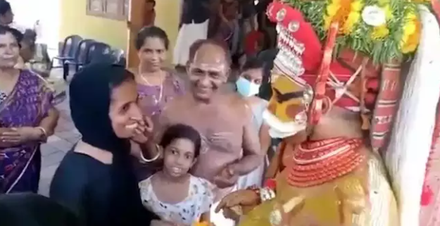 കഴിഞ്ഞ ദിവസം സമൂഹമാധ്യമങ്ങളിൽ നിറഞ്ഞ് നിന്ന വിഡിയോ ആയിരുന്നു മുസ്ലിം സ്ത്രീയെ അനുഗ്രഹിക്കുന്ന മുത്തപ്പന് തെയ്യത്തിന്റെത്. തന്റെ മുന്നിലെത്തിയ മുസ്ലിം സ്ത്രീയെ നീ വേറെയല്ലെന്നും ഇങ്ങ് വായെന്നും സ്നേഹത്തോടെ വിളിച്ച് ആശ്വസിപ്പിക്കുകയാണ് മുത്തപ്പന്.കാസര്കോട് വലിയ പറമ്പ സ്വദേശിനി എം ടി റംലത്തിനെയാണ് മുത്തപ്പന് തെയ്യം ആശ്വസിപ്പിച്ചത്.രണ്ട് വര്ഷം മുന്പ് റംലത്തിന്റെ ഭര്ത്താവ് അബ്ദുള് കരീമിന് ജോലി നഷ്ടമായി. മുംബൈയിലെ ഹോട്ടല് തൊഴിലാളിയായിരുന്നു കരീം. ഇവര്ക്ക് ഒരു ആണ്കുട്ടിയും രണ്ട് പെണ്മക്കളുമാണ് ഉള്ളത്. സാമ്പത്തികമായി വളരെ ഞെരുക്കത്തിലാണ് കുടുംബം. ഈ സങ്കടം കാരണമാണ് റംലത്ത് മുത്തപ്പന് തെയ്യത്തെ കാണാന് പോയത്. ആദ്യമായാണ് മുത്തപ്പനെ കാണുന്നതെന്നും വീഡിയോ ആക്കിയതൊന്നും താന് അറിഞ്ഞില്ലെന്നുമാണ് റംലത്ത് പറയുന്നത്.