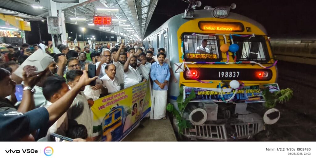 എറണാകുളത്ത് നിന്നും നിലമ്പൂരിലേക്കെത്തിയ മെമുവിന് നിലമ്പൂരില് ആര്യാടന് ഷൗക്കത്ത് എം.എല്.എയുടെ നേതൃത്വത്തില് ആവേശ വരവേല്പ്പ്. ലോക്കോ പൈലറ്റിനും യാത്രക്കാര്ക്കും മധുരം നല്കിയും വാദ്യമേളങ്ങളോടെയുമായിരുന്നു വരവേറ്റത്. യു.ഡി.എഫ്, റെയില്വെ ആക്ഷന് കമ്മിറ്റി, വ്യാപാരി സമൂഹം എന്നിവരും സ്വീകരണത്തിനുണ്ടായിരുന്നു. നിശ്ചയിച്ച സമയക്രമമായ 10.5നും രണ്ട് മിനിട്ട് മുമ്പെയാണ് മെമു എത്തിയത്.