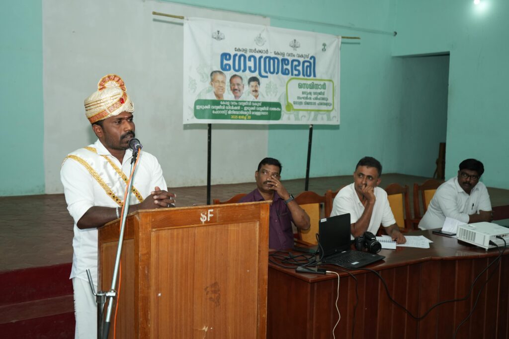 മനുഷ്യ വന്യജീവി സംഘര്ഷം ലഘൂകരിക്കുന്നതുമായി ബന്ധപ്പെട്ട് വനംവകുപ്പ് ‘ഗോത്രഭേരി’ എന്ന പേരില് സെമിനാര് സംഘടിപ്പിച്ചു. ആദിവാസി ഉന്നതികളില് താമസിക്കുന്നവരുടെ അറിവും അനുഭവസമ്പത്തും പങ്കുവയ്ക്കുകയായിരുന്നു ലക്ഷ്യം.വെള്ളാപ്പാറ ഫോറെസ്റ്റ് നേച്ചര് എഡ്യൂക്കേഷന് സെന്ററില് നടന്ന പരിപാടി കോവില്മല രാജാവ് രാമന് രാജമന്നാന് ഉദ്ഘാടനം ചെയ്തു. വന്യമൃഗങ്ങളെ പ്രതിരോധിക്കുന്നതിനുള്ള പരമ്പരാഗതരീതികള് പ്രയോഗിക്കുന്നതില്നിന്ന് പിന്നാക്കം പോയതാണ് മനുഷ്യ – വന്യ ജീവി സംഘര്ഷങ്ങളുടെ എണ്ണം കൂടാന് കാരണമെന്ന് അദ്ദേഹം പറഞ്ഞു. ഉള്വനത്തില് വന്യമൃഗങ്ങള്ക്കാവശ്യമായ ആഹാരപദാര്ഥങ്ങള് ലഭ്യമാണ്. എന്നാല് പുതിയ ആഹാരരീതികള് മനസിലാക്കിയ വന്യമൃഗങ്ങള് വീണ്ടും മനുഷ്യവാസ മേഖലയിലെത്തുന്നു. ഇതാണ് പ്രശ്നങ്ങളുടെ കാരണം.വന്യജീവി സംഘര്ഷം ലഘുകരിക്കുന്നത്തിന് വനം വകുപ്പ് നടപ്പാക്കുന്ന 10 മിഷനുകളില് ഒന്നായ മിഷന് ട്രൈബല് നോളജിന്റെ ഭാഗമായാണ് ‘ഗോത്രഭേരി’എന്ന പേരില് സെമിനാര് സംഘടിപ്പിച്ചത്. കോട്ടയം , ഇടുക്കി വന്യജീവി ഡിവിഷനുകളിലെ ജനങ്ങളെ പങ്കെടുപ്പിച്ച് വനം ഗവേഷണ ഇന്സ്റ്റിറ്റ്യൂട്ട്, ട്രൈബല് വകുപ്പ് എന്നിവരുടെ സംയുക്തആഭിമുഖ്യത്തിലാണ് പരിപാടി സംഘടിപ്പിച്ചത്.ഇടുക്കി വന്യജീവി സാങ്കേതത്തിലെ വന്മാവ്, കൊല്ലത്തിക്കാവ്, കിഴുകാനം,കണ്ണമ്പടി, മുല്ല, കത്തിതേപ്പന് പുന്നപാറ, വാക്കത്തി, തേക്ക്തോട്ടം, മുല്ലള്ള്, ഭീമന്ച്ചുവട്, മേമാരി എന്നീ ഊരുകളില് നിന്നും നഗരംപാറ റെയിഞ്ചിലെ മണിയാറന്കുടി, പെരുങ്കാല, വട്ടമേട്, കപ്പക്കാനാനം, ചക്കിമാലി – മുല്ലക്കാനം, കൊലുമ്പന് കോളനി, അയ്യപ്പന്കോവില് റെയിഞ്ചിലെ അഞ്ചുരുളി, കോവില്മല, പാമ്പാടിക്കുഴി, മുരിക്കാട്ടുകുടി എന്നീ ആദിവാസി ഉന്നതികളില് നിന്നുള്ളവര് പങ്കെടുത്തു.മിഷന് ട്രൈബല് നോളജ് സംസ്ഥാന കോ-ഓഡിനേറ്റര് രാജു കെ. ഫ്രാന്സിസ് , പീച്ചി കേരള വന ഗവേഷണ കേന്ദ്രം സീനിയര് സയന്റിസ്റ്റ് , ഡോ. എ. വി. രഘു ,ഇടുക്കി വൈല്ഡ് ലൈഫ് വാര്ഡന് ജി. ജയചന്ദ്രന്, സോഷ്യല് ഫോറസ്ട്രി ഡിവിഷന് ഇടുക്കി അസിസ്റ്റന്റ് കണ്സര്വേറ്റര് ഓഫ് ഫോറസ്റ്റ് പി. കെ. വിപിന് ദാസ്, ട്രൈബല് എക്സ്റ്റന്ഷന് ഓഫീസര്മാരായ റോയി, ആനിയമ്മ തുടങ്ങിയവര് നേതൃത്വം നല്കി.