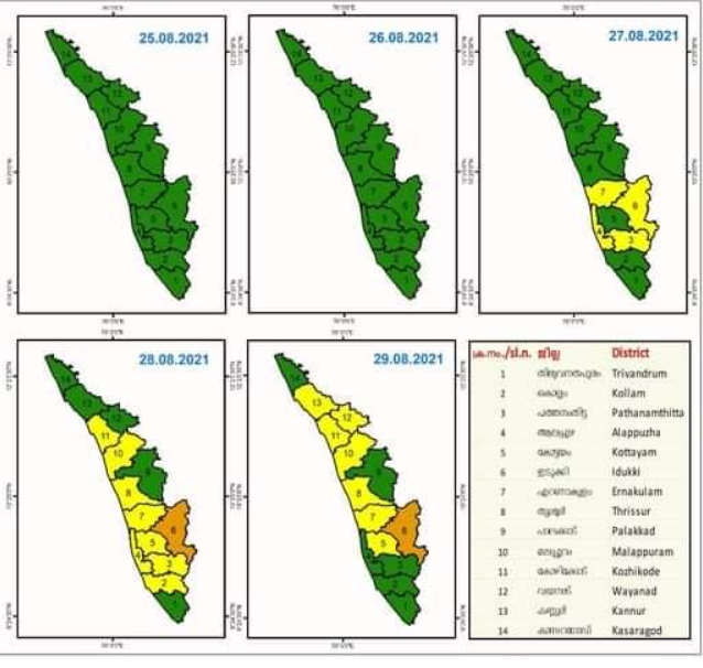 2021 ഓഗസ്റ്റ് 27 ന് പത്തനംതിട്ട, ആലപ്പുഴ, എറണാകുളം, ഇടുക്കി ജില്ലകളിലും 2021 ഓഗസ്റ്റ് 28 ന് കൊല്ലം, പത്തനംതിട്ട, ആലപ്പുഴ, കോട്ടയം, എറണാകുളം, തൃശൂര്, മലപ്പുറം, കോഴിക്കോട് ജില്ലകളിലും 2021 ഓഗസ്റ്റ് 29 ന് കോട്ടയം, എറണാകുളം, തൃശൂര്, മലപ്പുറം, കോഴിക്കോട്, വയനാട്, കണ്ണൂര് എന്നീ ജില്ലകളിലും ശക്തമായ മഴക്കുള്ള സാധ്യതയുള്ളതിനാല് കേന്ദ്ര കാലാവസ്ഥ വകുപ്പ് യെല്ലോ അലെര്ട് പ്രഖ്യാപിച്ചിട്ടുണ്ട്.