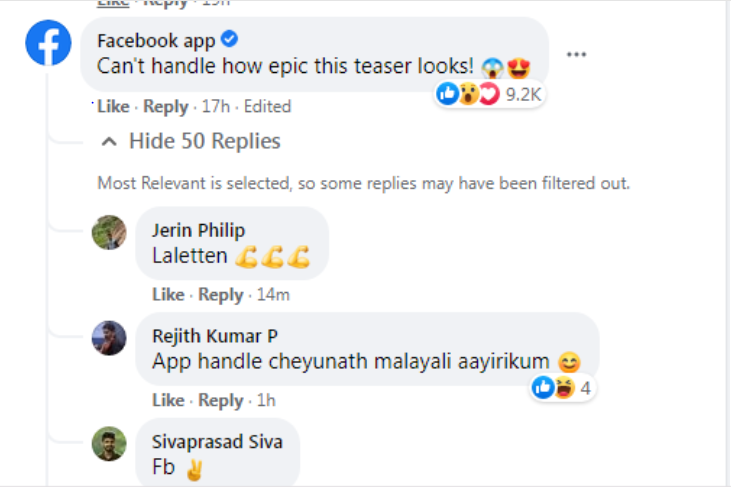 ആരാധകരെ മാത്രമല്ല ഫേസ്ബുക്കിനെ വരെ ഞെട്ടിച്ചിരിക്കുകയാണ് മരക്കാർ ടീസർ. ചിത്രത്തിന്റെ ടീസര്‍ പങ്കുവച്ച മോഹൻലാലിന്‍റെ ഔദ്യോഗിക പേജിൽ ഐതിഹാസിക ടീസറെന്ന് കമന്റ് ചെയ്തിരിക്കുകയാണ് ഫേസ്ബുക്ക് ടീം. ഫേസ്ബുക്ക് കമന്‍റിന് താഴെ ചിത്രത്തെ പ്രകീര്‍ത്തിച്ചുകൊണ്ടുള്ള വാക്കുകളുമായി ആരാധകരും എത്തിയിട്ടുണ്ട്.