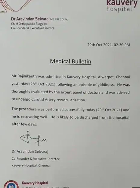 തലകറക്കം അനുഭവപ്പെട്ടതിനെ തുടർന്നാണ് അദ്ദേഹത്തെ ആശുപത്രിയിൽ പ്രവേശിപ്പിച്ചത്. രജനി സുഖം പ്രാപിച്ചു വരുന്നതായും ഏതാനും ദിവസങ്ങൾക്കുള്ളിൽ ആശുപത്രി വിടാൻ സാധിക്കുമെന്നും മെഡിക്കൽ ബുള്ളറ്റിനിൽ പറയുന്നു.