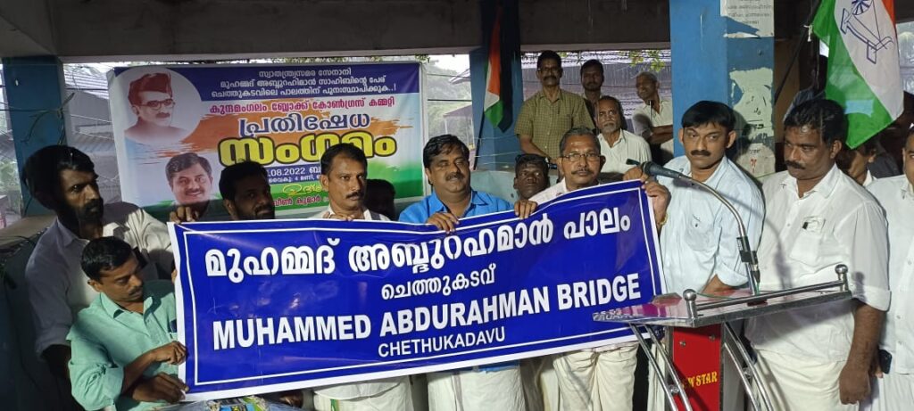 സ്വാതന്ത്ര്യസമര സേനാനിയും കെപിസിസി പ്രസിഡന്റ്‌ മായിരുന്ന മുഹമ്മദ്‌ അബ്‌ദുറഹ്മാൻ സാഹബ്ബിന്റെ പേര് മാറ്റി ചെത്തുകടവ് പാലം എന്നാക്കി മാറ്റിയതിൽ പ്രതിഷേധിച്ചു കുന്ദമംഗലം ബ്ലോക്ക് കോൺഗ്രസ്‌ കമ്മിറ്റിയുടെ നേതൃത്വത്തിൽ പ്രതിഷേധസംഗമം സംഘടിപ്പിച്ചു, കോൺഗ്രസ്‌ കമ്മിറ്റിയുടെ നേതൃത്വത്തിൽ അബ്‍ദുറഹ്മാൻ സഹബ്ബിന്റെ പേരിൽ ബോർഡ് പുനഃസ്ഥാപിക്കും.ഡിസിസി പ്രസിഡന്റ്‌ അഡ്വ. പ്രവീൺ കുമാർ ഉത്ഘാടനം ചെയ്തു, ബ്ലോക്ക് കോൺഗ്രസ്‌ പ്രസിഡന്റ്‌ എംപി കേളുക്കുട്ടി അധ്യക്ഷത വഹിച്ചു നേതാക്കളായ വിനോദ് പടനിലം, അബ്ദുറഹ്മാൻ എടക്കുനി, എം ധനീഷ്ലാൽ, സിവി സംജിത്ത്, ടി കെ ഹിതേഷ്കുമാർ, വേലായുധൻ പി കെ, എം കെ അനീഷ്, പത്മാക്ഷൻ,ഷിജു മുപ്രമ്മൽ, സിപി രമേശൻ, ഗിരീശൻ, ലീനവാസുദേവൻ | ജിഷ ചോലക്കമണ്ണിൽ സംസാരിച്ചു